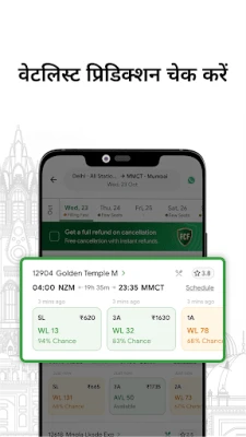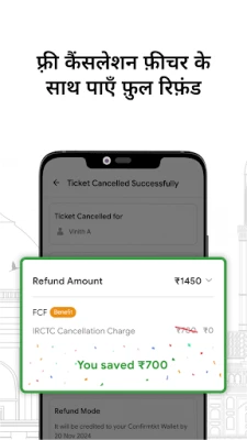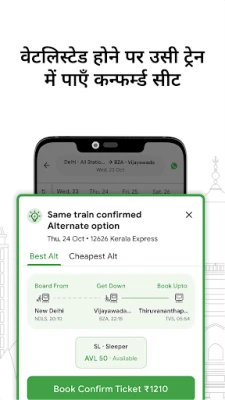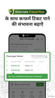 ConfirmTkt आपकी यात्रा को चिंतामुक्त बनाने के लिए अनोखी सुविधाएँ लाता है। "ऑल्टरनेट ट्रैवल प्लान" (पहले ट्रैवल गारंटी के नाम से ज्ञात) के साथ, यदि आपकी ट्रेन टिकट वेटलिस्टेड रहती है, तो आपको कन्फर्म सीट मिलेगी या आपके चुने गए मोड (फ़्लाइट के लिए 3X, बस के लिए 3X, ट्रेन के लिए 2X) के अनुसार रिफ़ंड। ConfirmTkt के "ऑल्टरनेट्स" और "प्रेडिक्शन" फ़ीचर से कन्फर्म टिकट पाने की अपनी संभावनाएँ बढ़ाएँ, जो ट्रेन + ट्रेन या ट्रेन + बस जैसे लचीले विकल्प सुझाता है। साथ ही, ConfirmTkt का 'फ़्री कैंसलेशन' सुविधा आपको तुरंत और पूरा रिफंड सुनिश्चित करती है। अपनी यात्रा के दौरान 'ऑर्डर फ़ूड ऑन ट्रेन' फ़ीचर का उपयोग करके अपनी सीट पर ही स्वादिष्ट भोजन का आनंद लें।