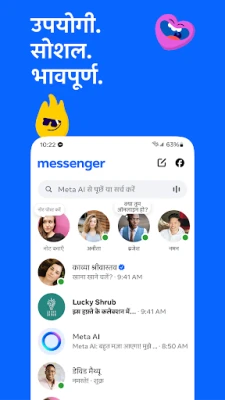 Messenger एक ऐसा मंच है जहाँ दूरियाँ मायने नहीं रखतीं। अपने दोस्तों, परिवार और प्रियजनों से सहजता से जुड़ें, चाहे वे Facebook पर हों या कहीं और। आपको फ़ोन नंबर की ज़रूरत नहीं है, बस एक टैप से आप टेक्स्ट मैसेज भेज सकते हैं या ऑडियो-वीडियो कॉल कर सकते हैं। अपनी ज़िंदगी के पलों को Messenger के ज़रिए हाई डेफ़िनिशन फ़ोटो के रूप में साझा करें, ताकि हर तस्वीर अपनी पूरी जीवंतता के साथ दिखे। यह आपके प्रियजनों से हर पल जुड़े रहने का सबसे आसान और प्रभावशाली तरीका है।